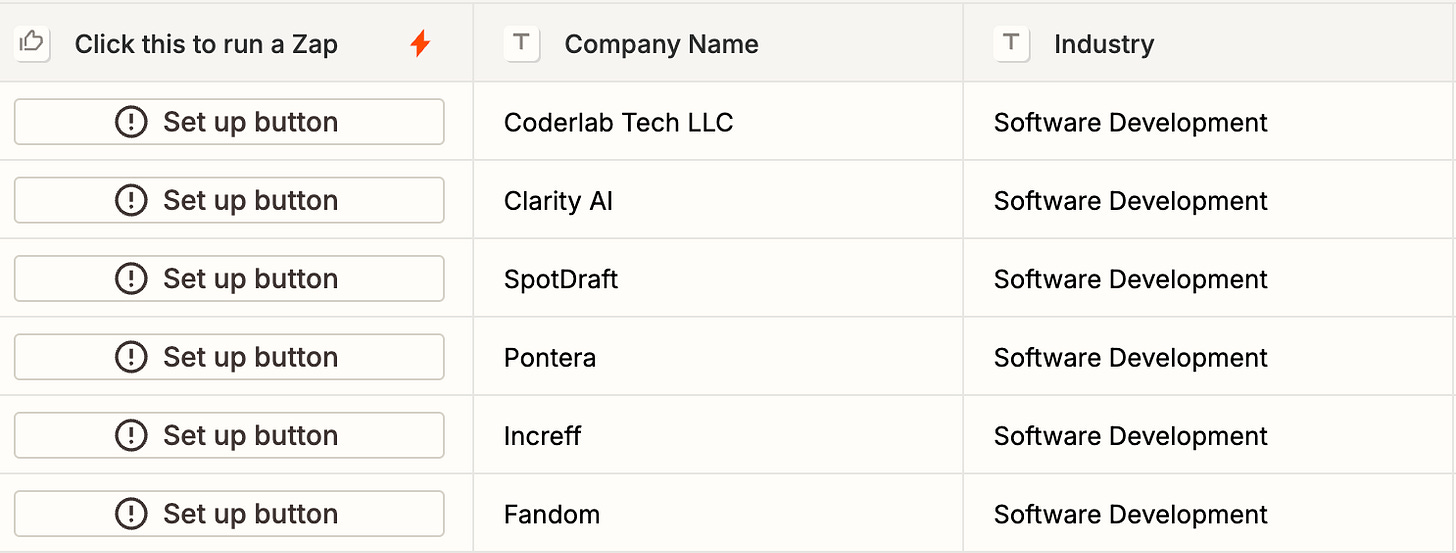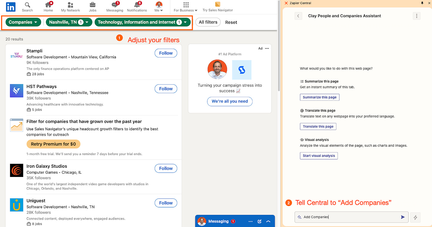 One of the first things that piqued my interest in Bryce’s article was how easy it was to build lists of prospects with Zapier. Using Zapier’s new AI agent service, Zapier Central, it was presumably as easy as performing a search with filters on LinkedIn and then instructing the AI agent to add the companies to your Zapier Table (example from the article below). In fact, according to Bryce, “This is so easy I feel silly.” Oh, Bryce…how I wish I could feel that same silliness…