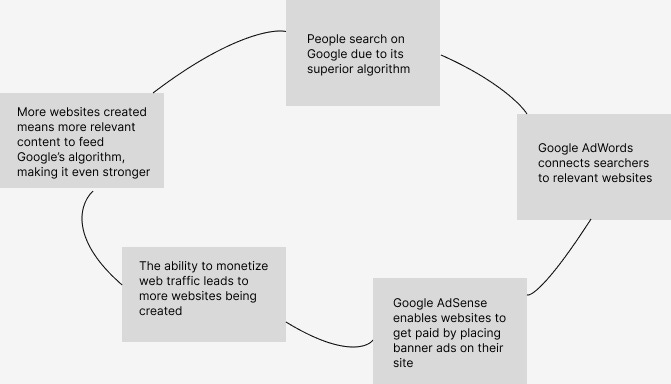 Google’s dominance in search and the advantage it has gotten from creating a robust data network cannot be under-estimated. It has created a flywheel for Google that has enabled it to expand and dominate over markets. A good outline of Google’s early flywheel was as follows:
