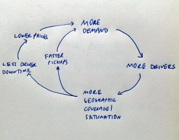 With every driver Uber added to the platform, the geographic reach of the app expanded. This resulted in a shorter wait times for each ride for Uber users. Shorter wait times helped attract additional users, which then led to a further increase in drivers, which meant even greater geographic reach and less time required to find a ride.
